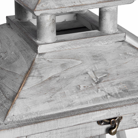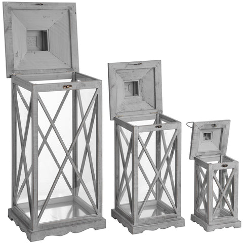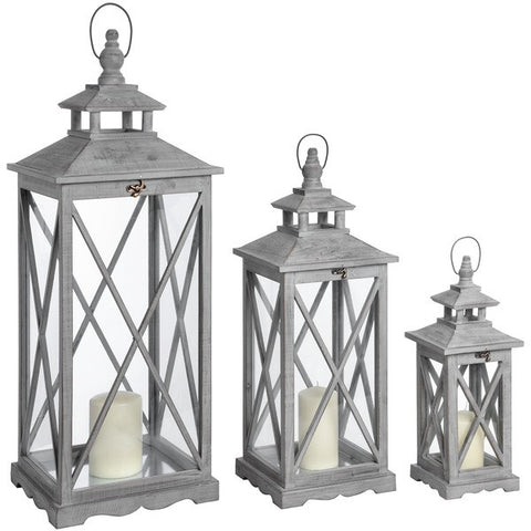 Set Of Three Wooden Lanterns With Traditional Cross Section. In a whitewash finish on wood and metal clasp. Looking elegant and romantic particularly when clustered together with pillar candles
